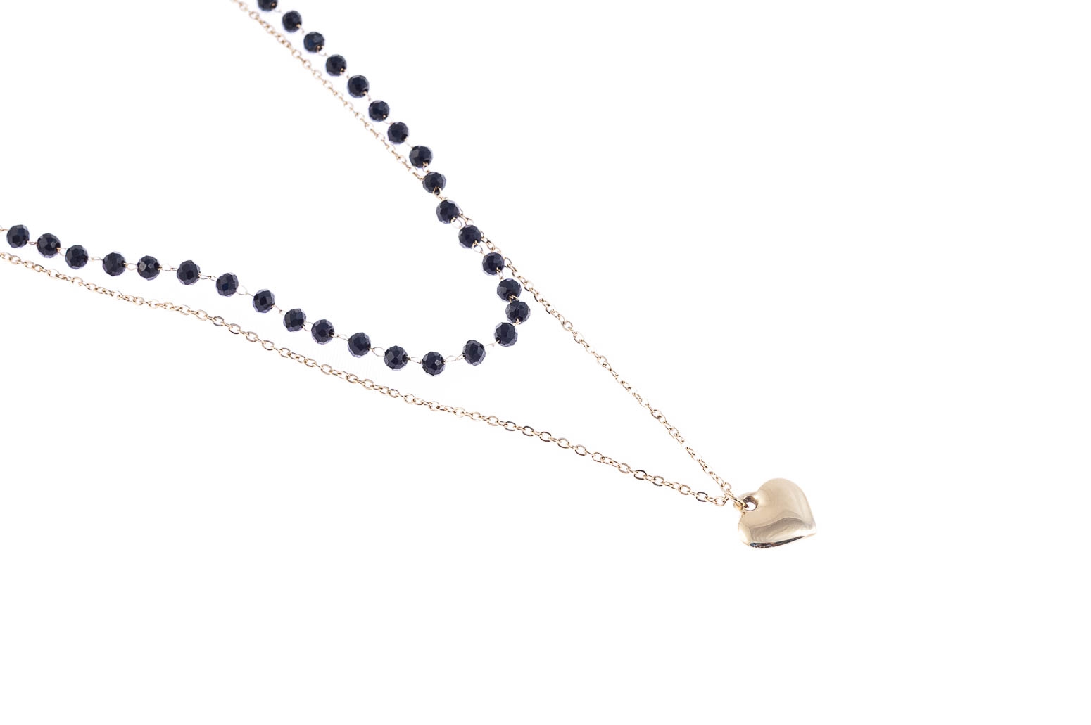 Elegancki, złoty łańcuszek z uroczą przywieszką w kształcie serduszka. Naszyjnik ozdobiny jest szlifowanymi, czarnymi koralikami.