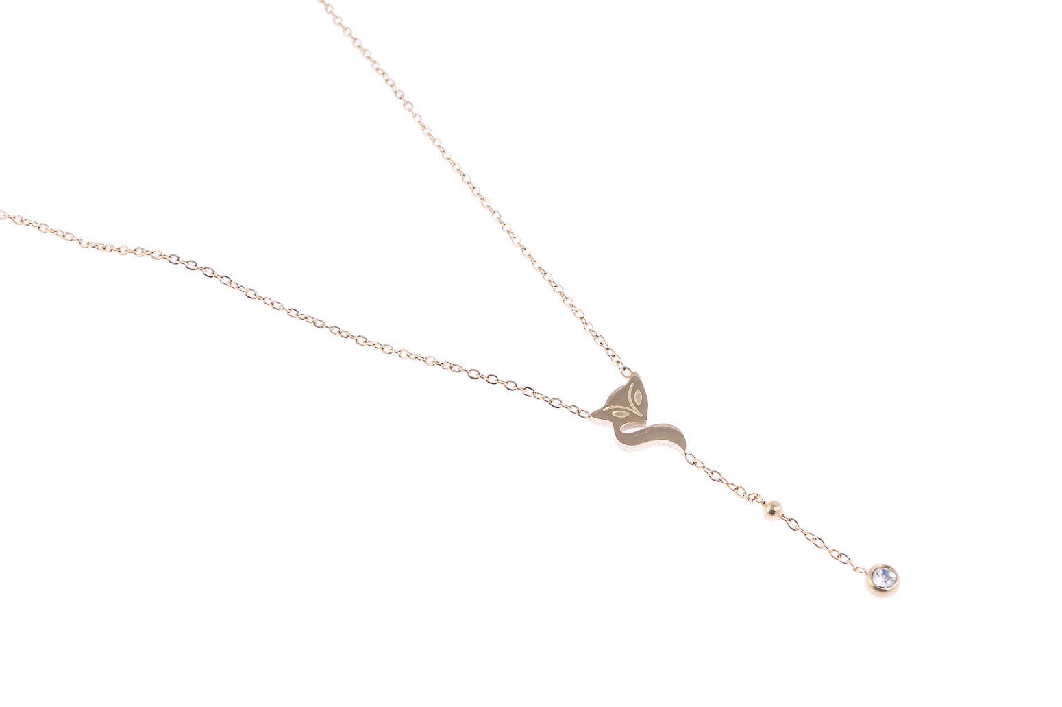 Elegancki, złoty łańcuszek z uroczą przywieszką w kształcie liska, ozdobioną pięknie mieniącym się dżetem.