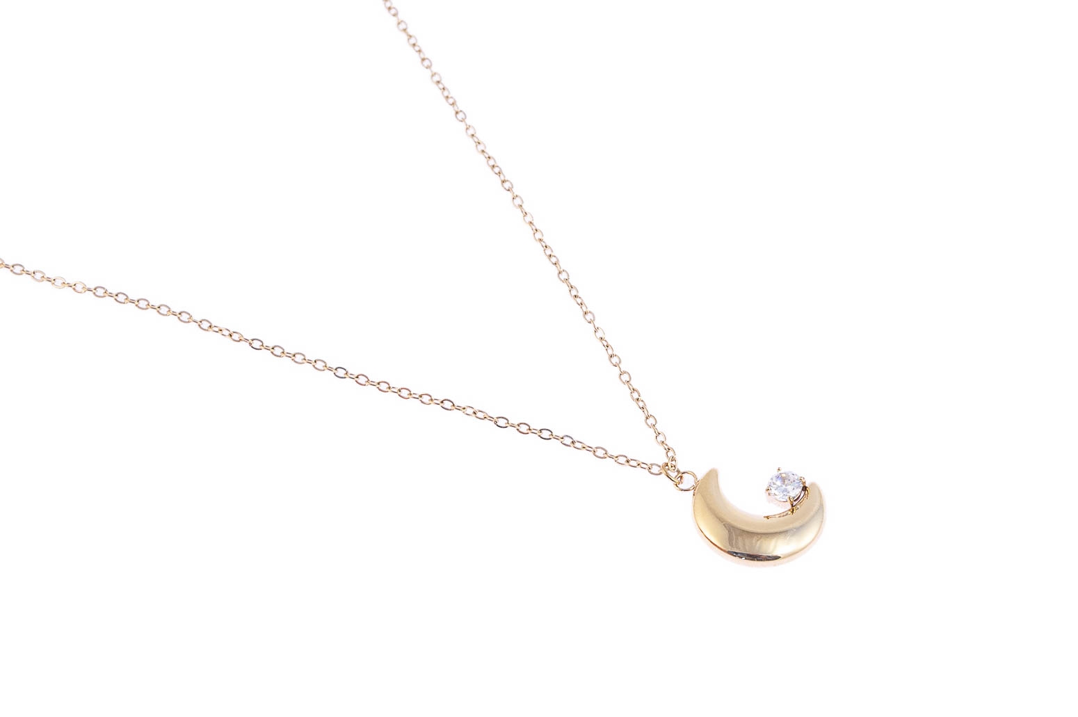 Elegancki, złoty łańcuszek z uroczą przywieszką w kształcie księżyca, ozdobioną pięknie mieniącym się dżetem.Wymiary naszyjnika:
