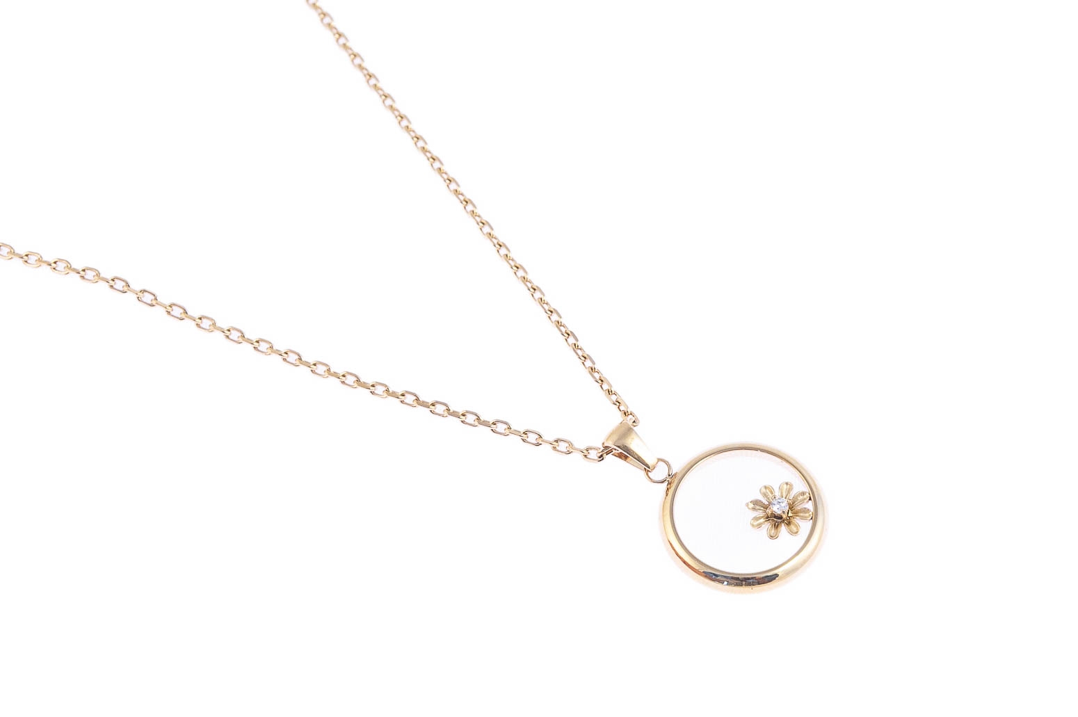 Elegancki, złoty łańcuszek z uroczą przywieszką, ozdobioną pięknie mieniącym się dżetem.
