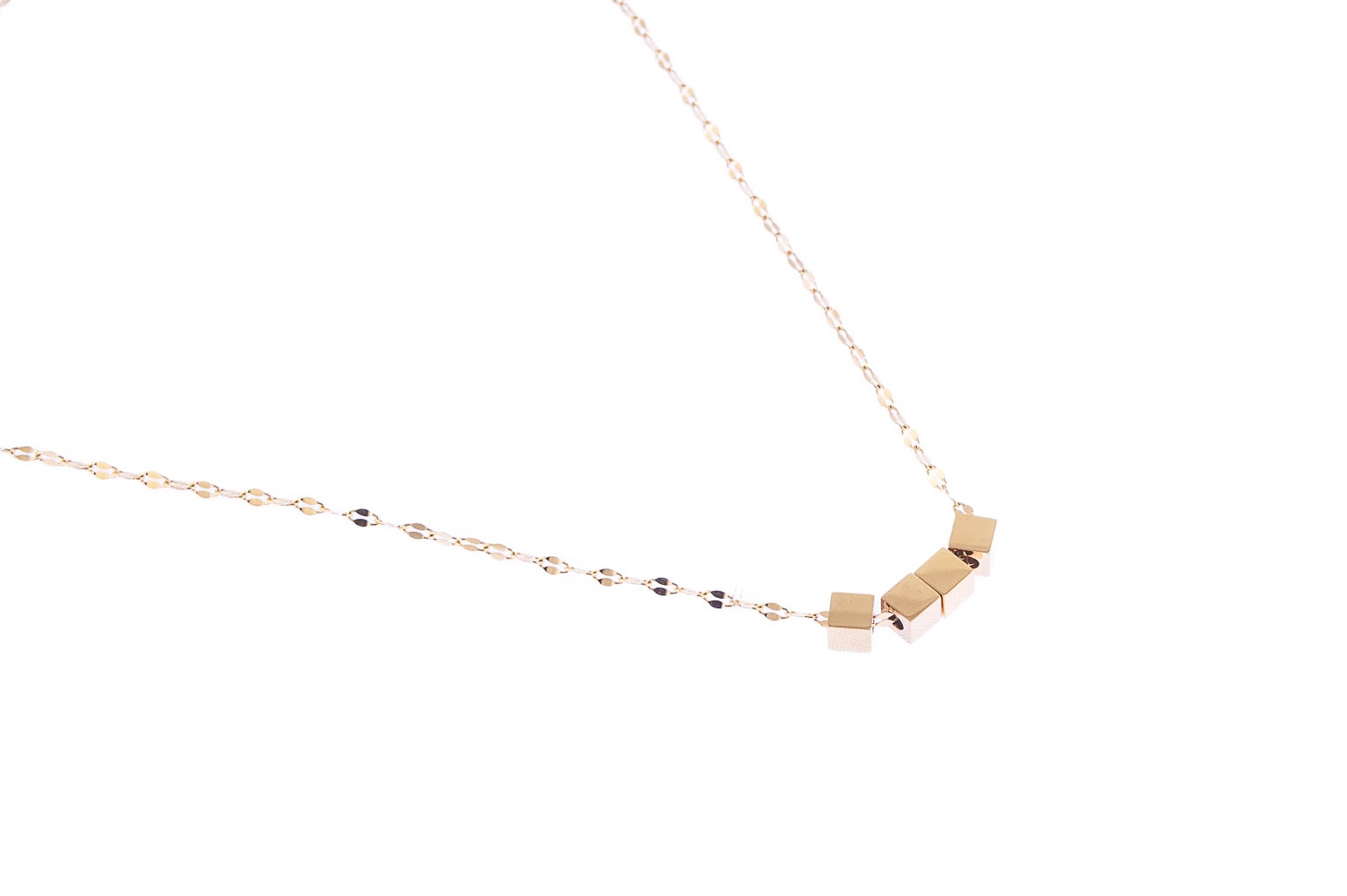 Elegancki łańcuszek z uroczymi przywieszkami w kształcie kostek. Naszyjnik jest w kolorze złotym.Wymiary naszyjnika: