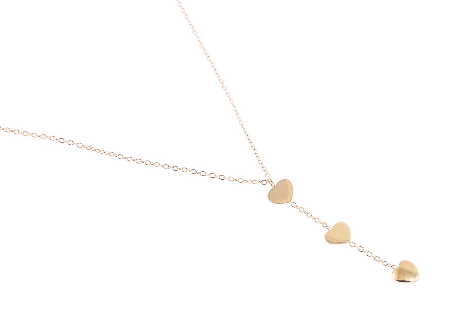 Elegancki łańcuszek z uroczymi przywieszkami w kształcie serduszek. Naszyjnik jest w kolorze złotym.