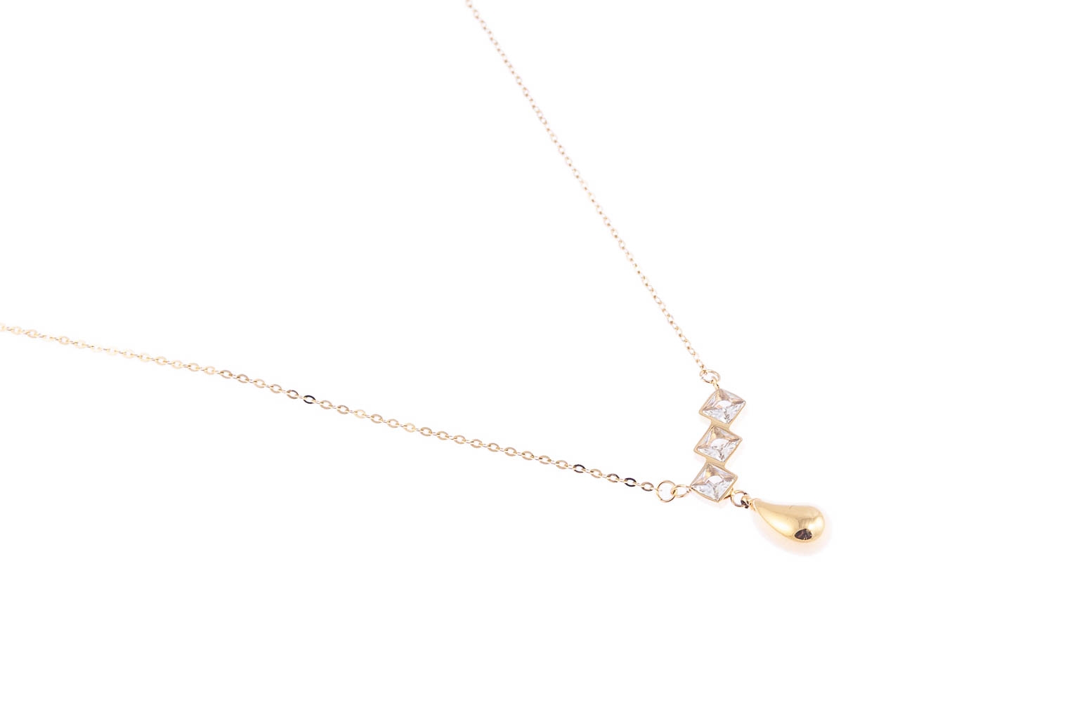 Elegancki łańcuszek z przywieszką ozdobioną pięknie mieniącymi się kamieniami. Naszyjnik jest w kolorze złotym.