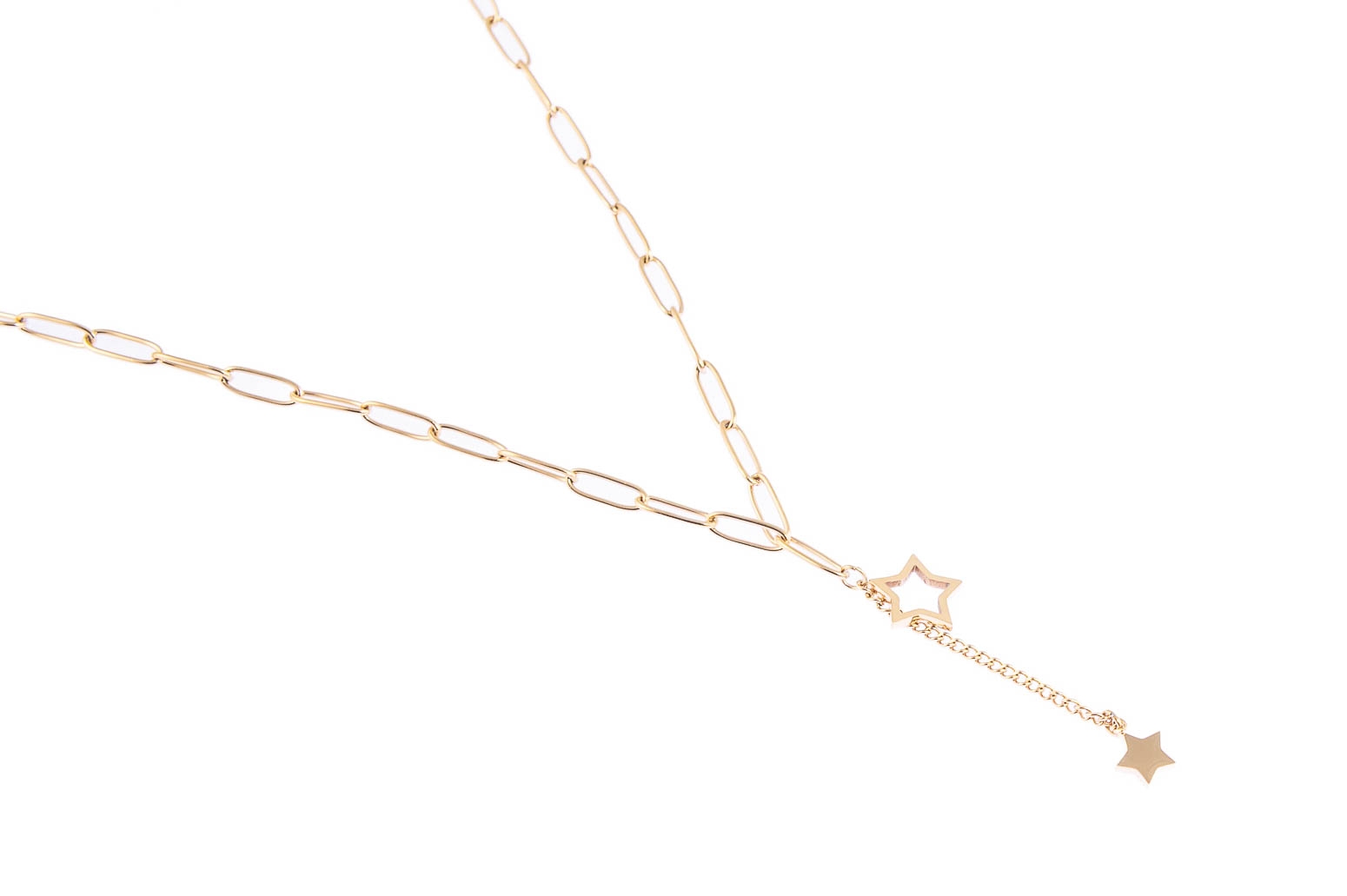 Elegancki łańcuszek z uroczymi przywieszkami w kształcie gwiazdek. Naszyjnik jest w kolorze złotym.Wymiary naszyjnika: