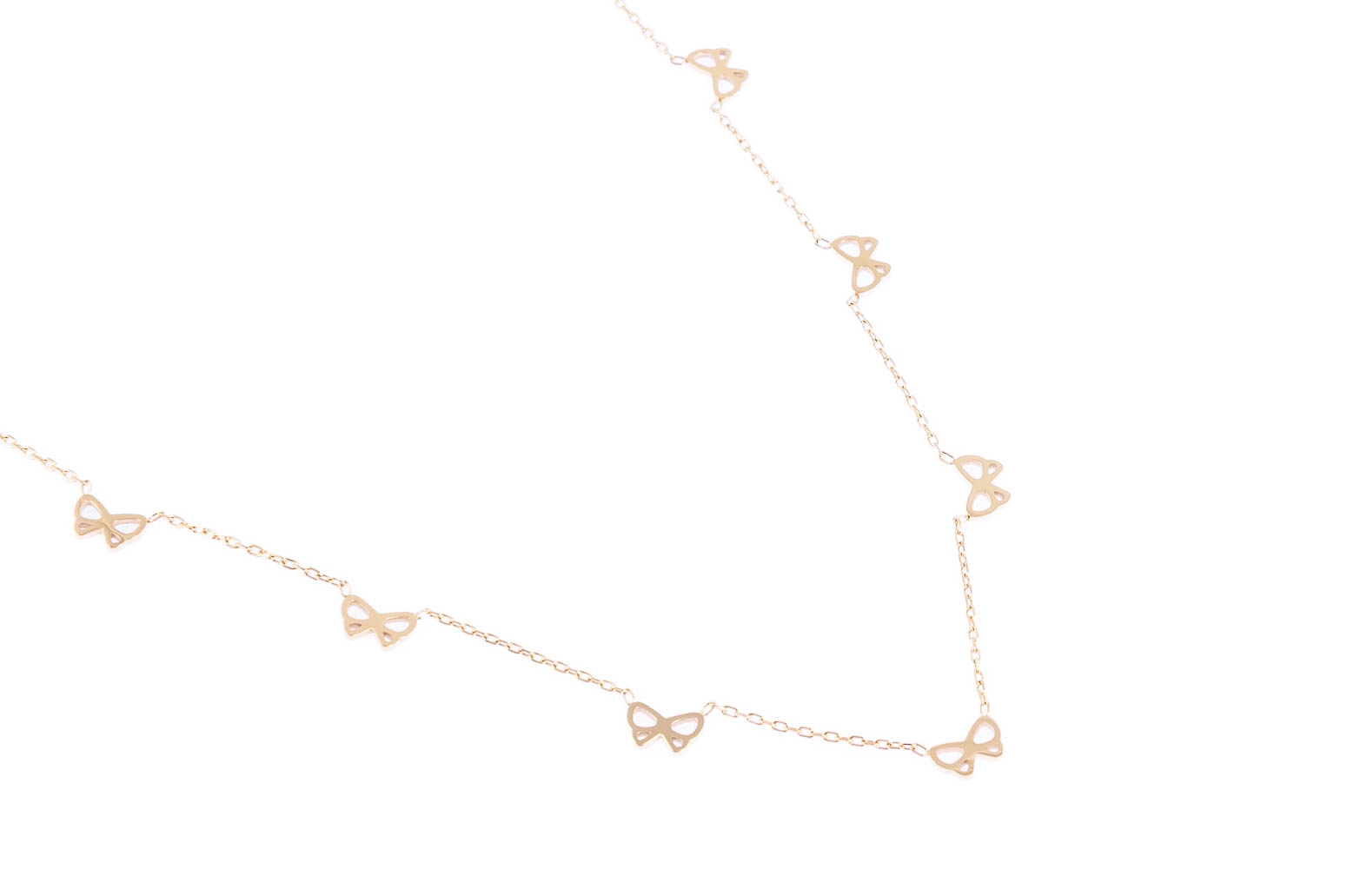 Elegancki łańcuszek z uroczymi przywieszkami w kształcie kokardek. Naszyjnik jest w kolorze złotym.