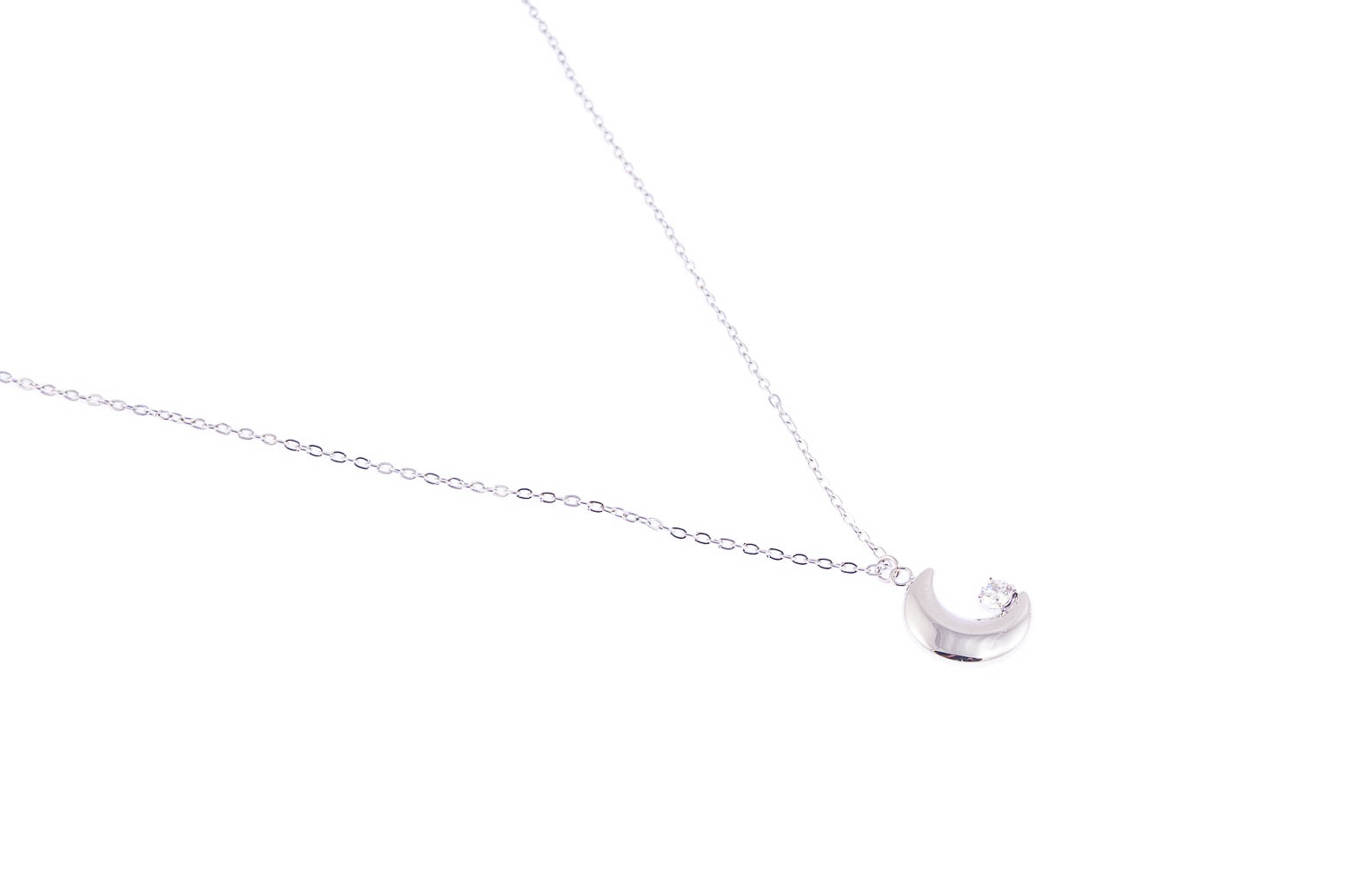 Elegancki łańcuszek z uroczą przywieszką w kształcie księżyca. Naszyjnik jest w kolorze srebrnym.