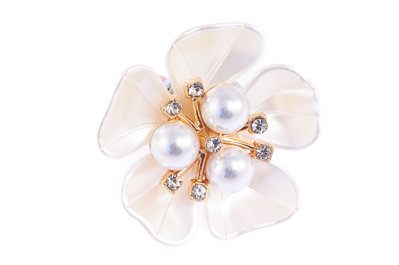 Elegancka ozdoba maskująca guzik mankietowy w kształcie kwiata. Biała ozdoba w oprawie w kolorze złotym, ozdobiona perłami i dżetami.