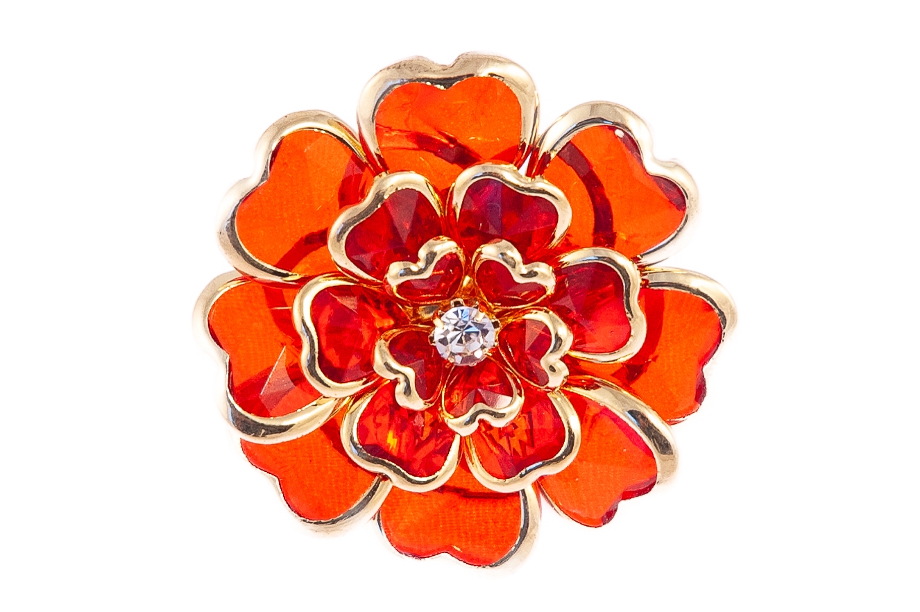 Elegancka ozdoba maskująca guzik mankietowy w kształcie kwiata. Czerwona ozdoba w oprawie w kolorze złotym, ozdobina szlifowanymi kamieiami.