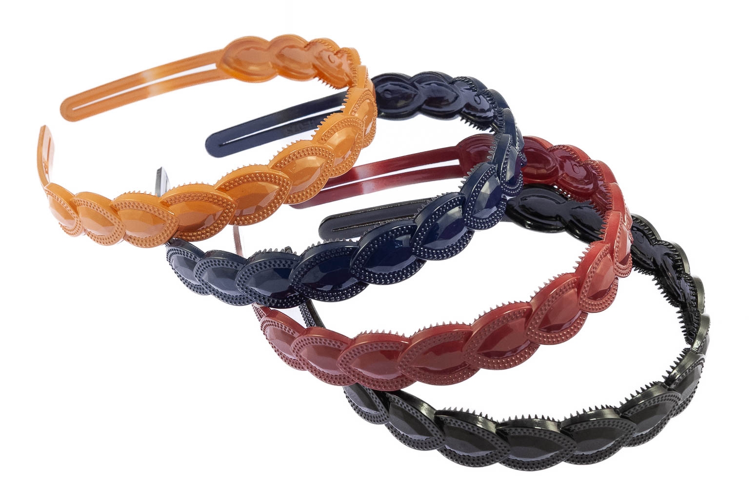 Klasyczna opaska wykonana z trwałego materiału, ozdobiona elegancim wzorem.Zestaw składa się z czterech kolorów: czarny, beżowy, granatowy i brązowy.