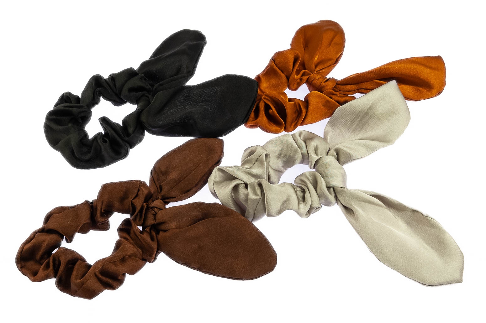 Klasyczne gumki do włosów z uroczą ozdobą w kształcie kokardki.Zestaw składa się z czterech kolorów: beżowy, czarny, jasny i ciemny brązowy.