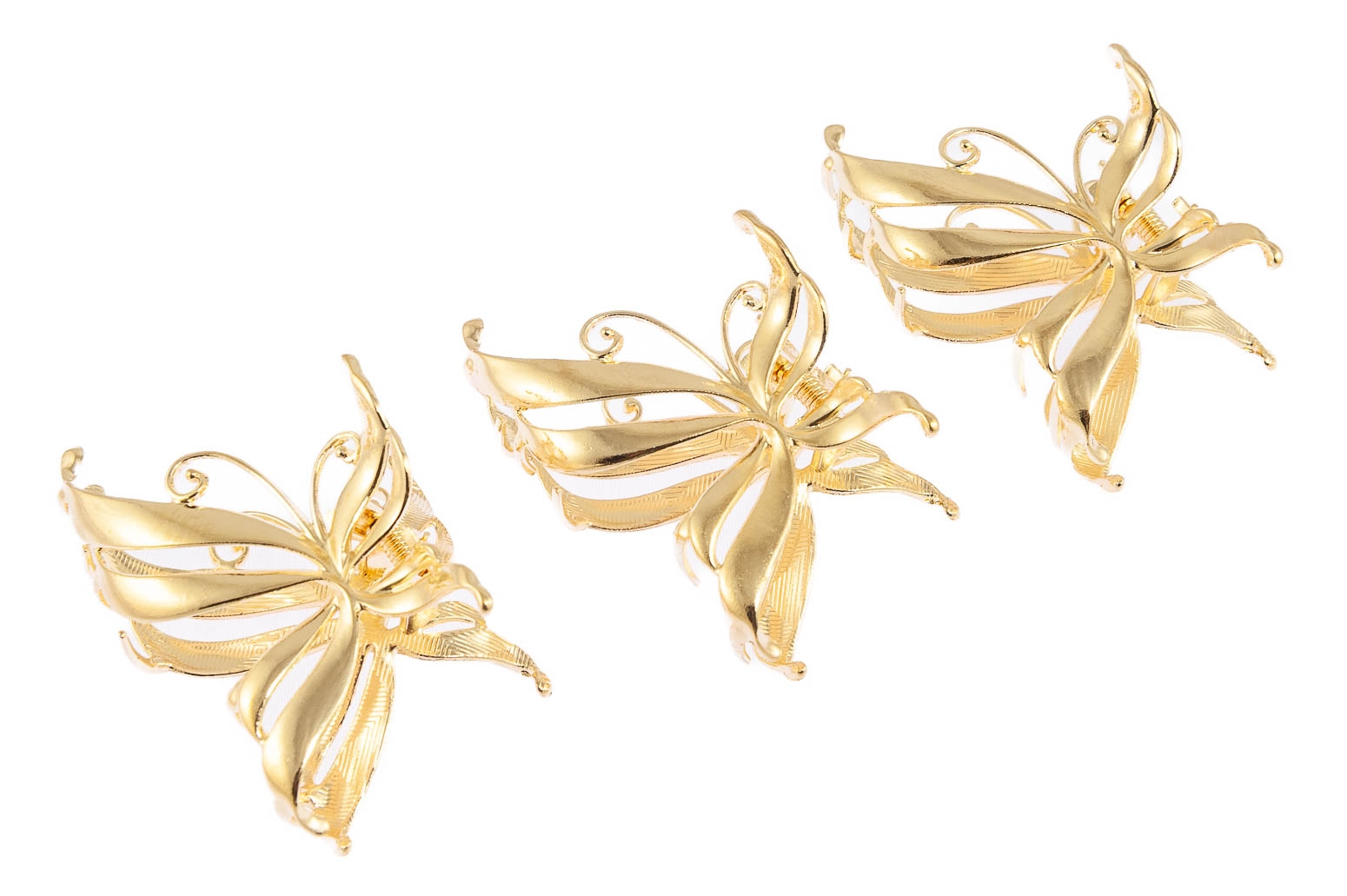Oryginalna spinka do włosów wykonana z wytrzymałego materiału. Zestaw skada się ze spinek w kolorze złotym. Wymiary szczęki: Długość: 7 cm Szerokość: 4,5 cm
