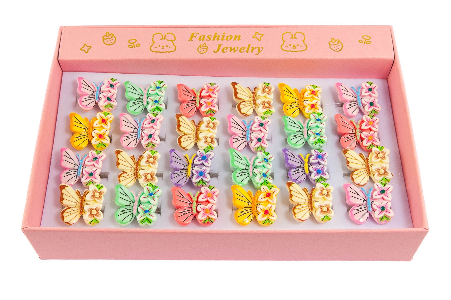 Dziecięce pierścionki w kolorze srebrnym z kolorowym motylkiem.Pierścionki posiadają regulację średnicy.
