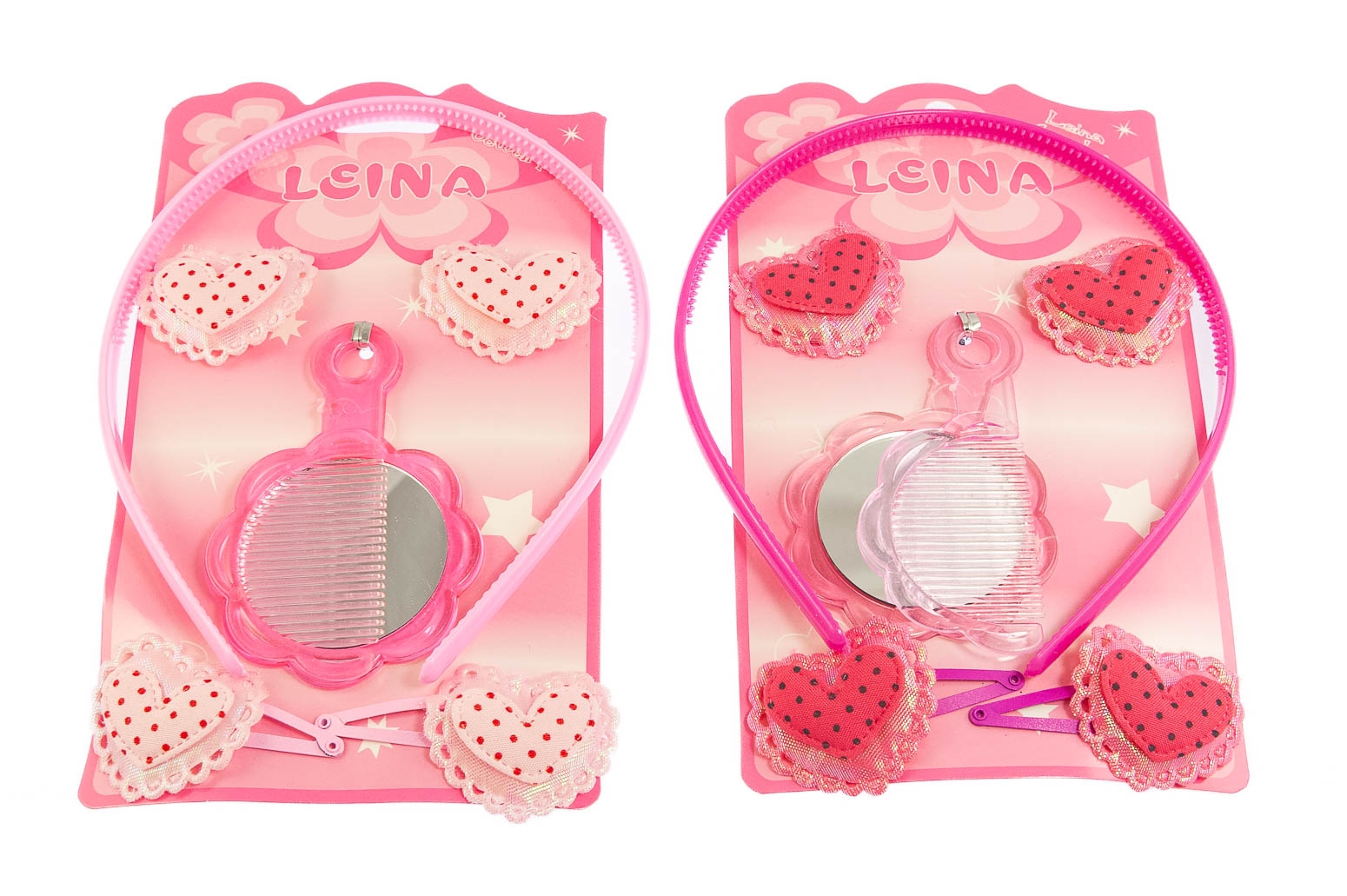 Zestaw składa się z pary gumeczek i spinek, opaski oraz lusterka z grzebykiem. Gumki i spinki ozdobione są serduszkami w kropeczki.