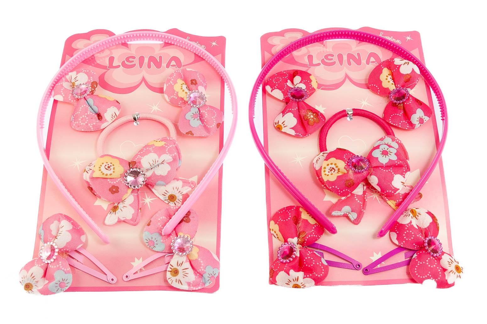 Zestaw składa się z pary gumeczek i spinek, opaski i gumki. Gumki i spinki ozdobione są kokardkami.