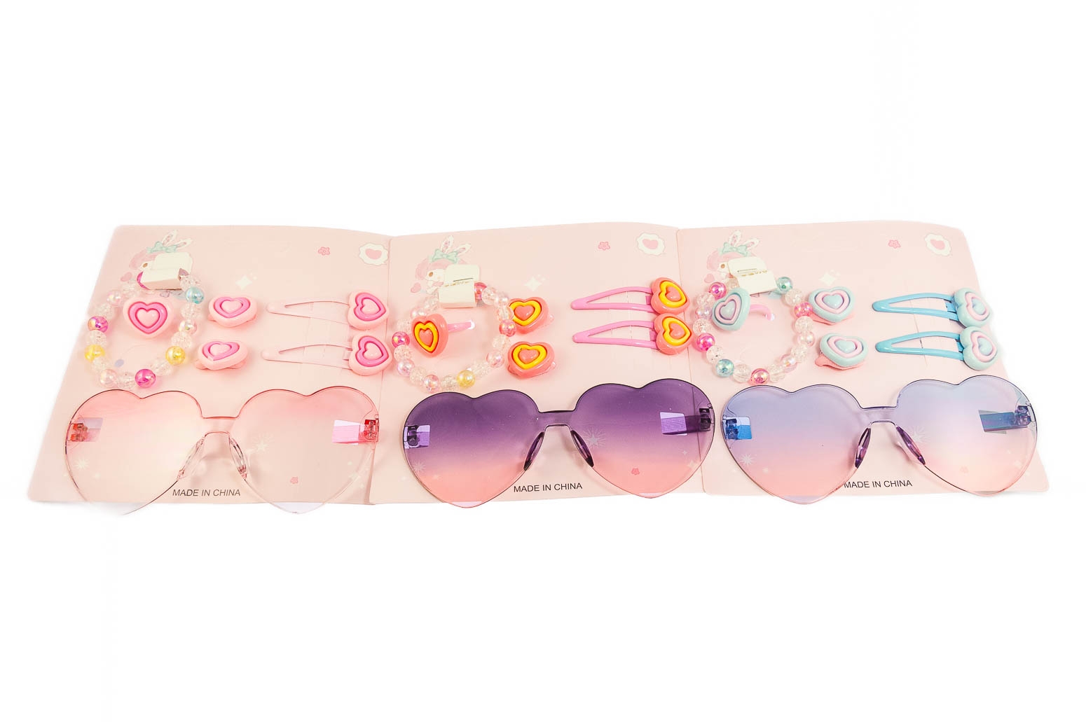 Urocze zestawy prezentowe.Zestaw składa się z pierścionka, bransoletki, gumek, spinek i okularów. Zestaw ozdobiony jest serduszkami.