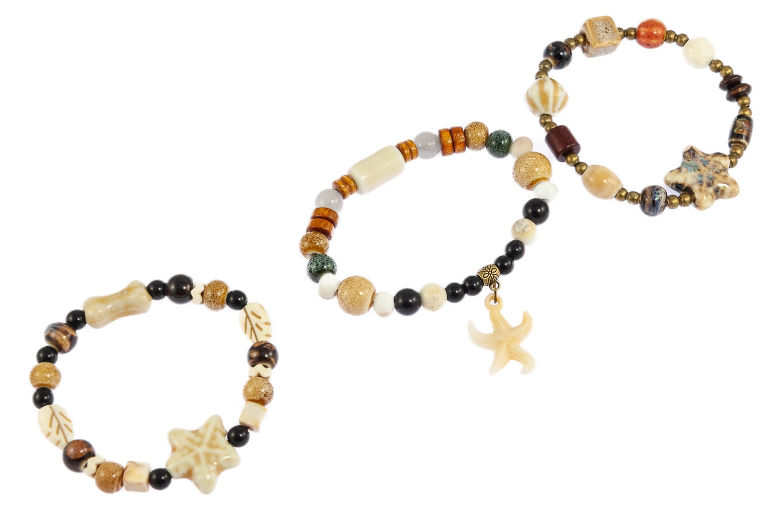 Elegancka bransoletka wykonana z brązowych koralików i muszelek.