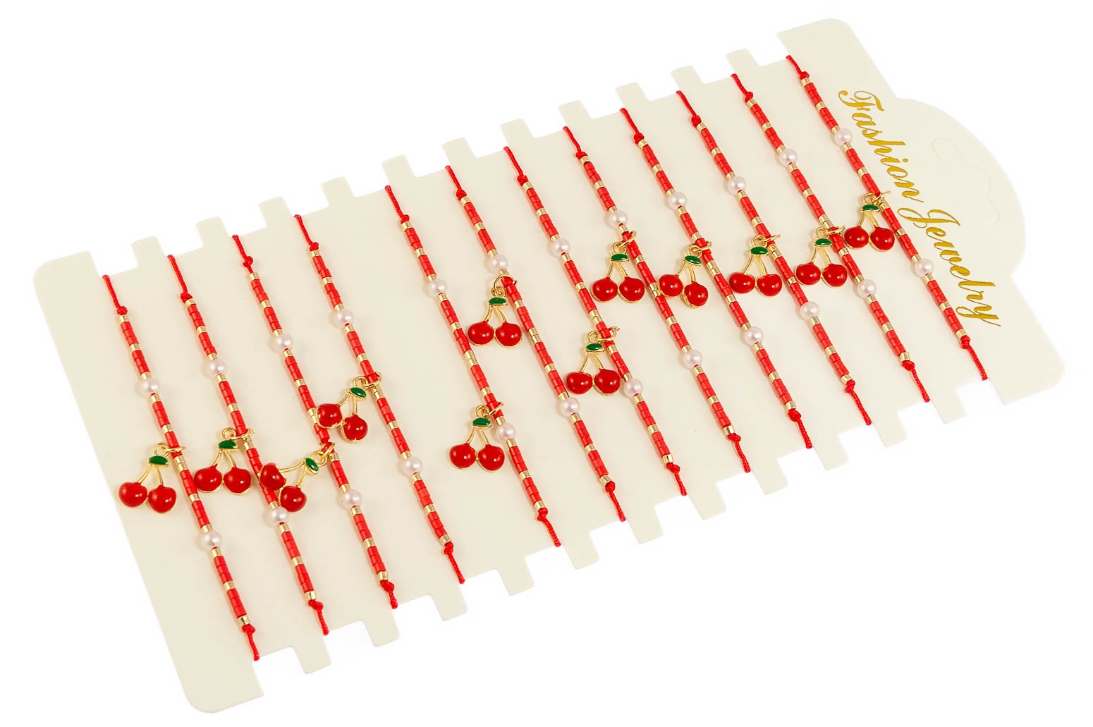 Urocze bransoletki, składające się ze sznurków, koralików i ozdoby z kształcie wisienki.