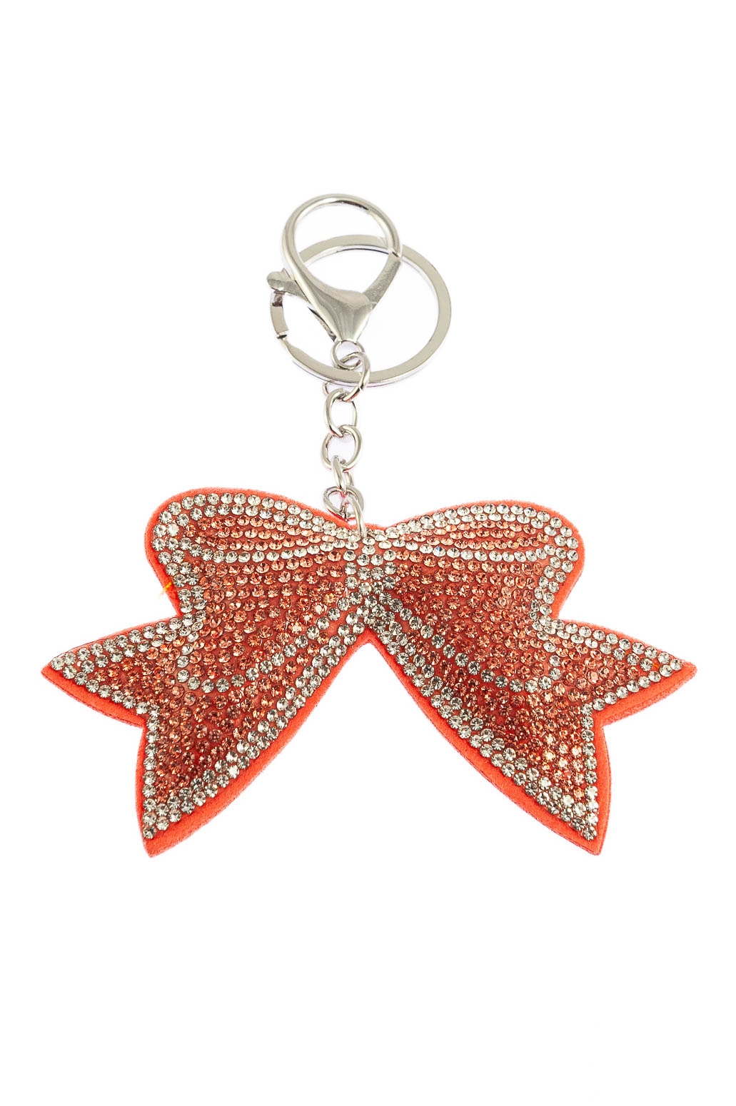 Elegancki brelok w kształcie kokardki, ozdobiony dżetami w kolorze różowym.