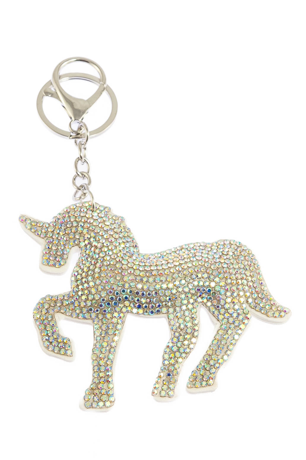 Elegancki brelok w kształcie jednorożca, ozdobiony dżetami w kolorze białym.