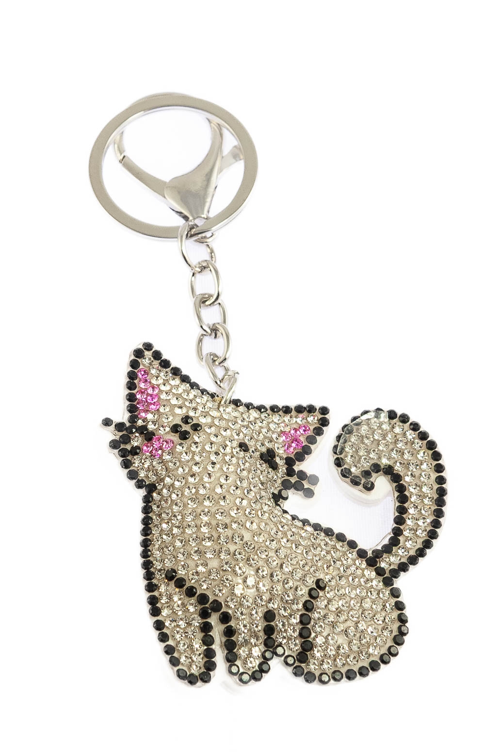 Elegancki brelok w kształcie kotka, ozdobiony dżetami w kolorze białym.