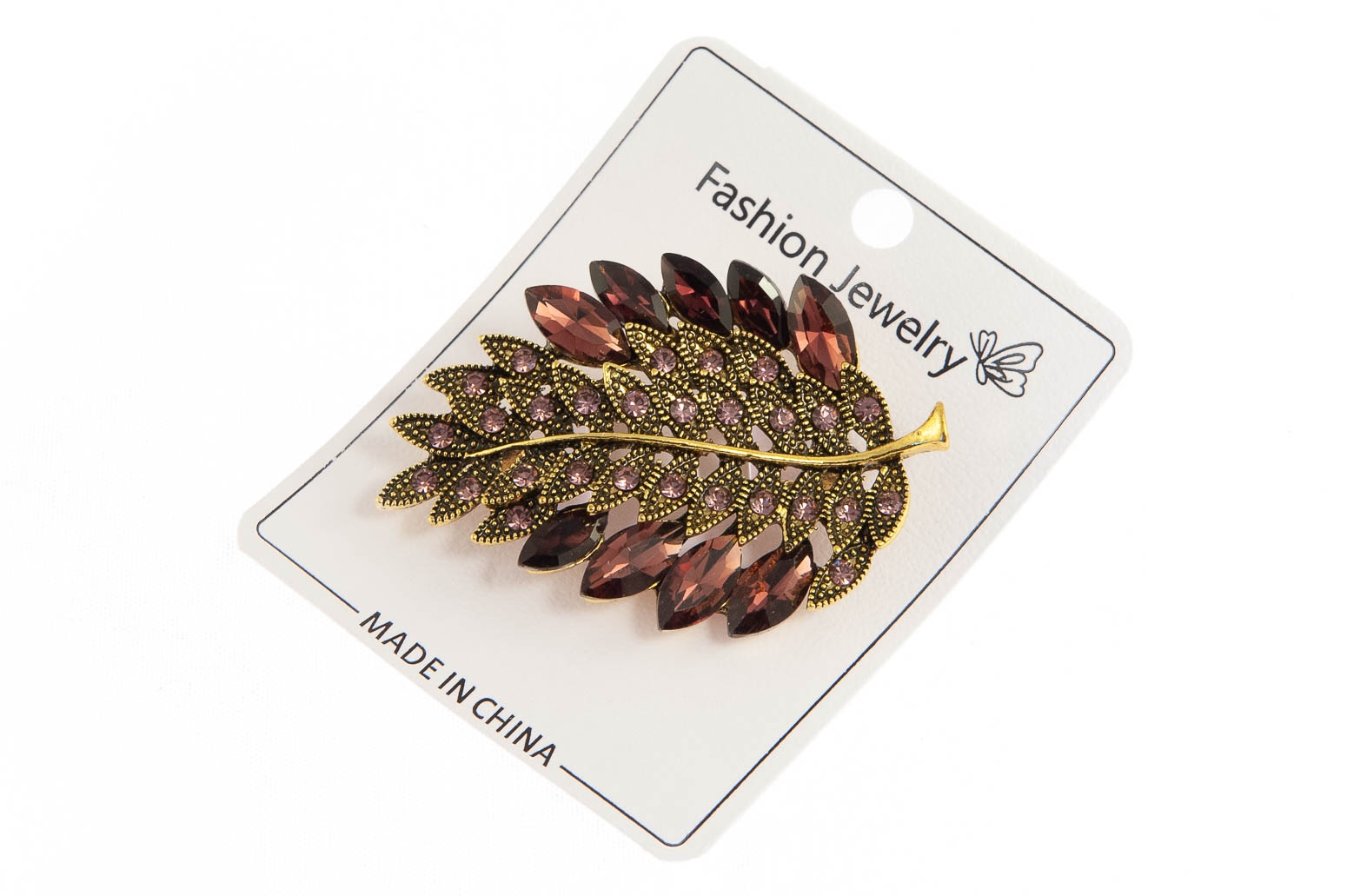 Elegancka broszka w kształcie listka. Przywieszka w kolorze złotym, ozdobiona szlifowanymi kamieniami.