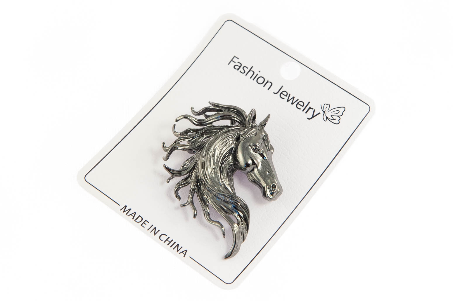 Elegancka broszka w kształcie głowy konia. Przywieszka w kolorze grafitowym.