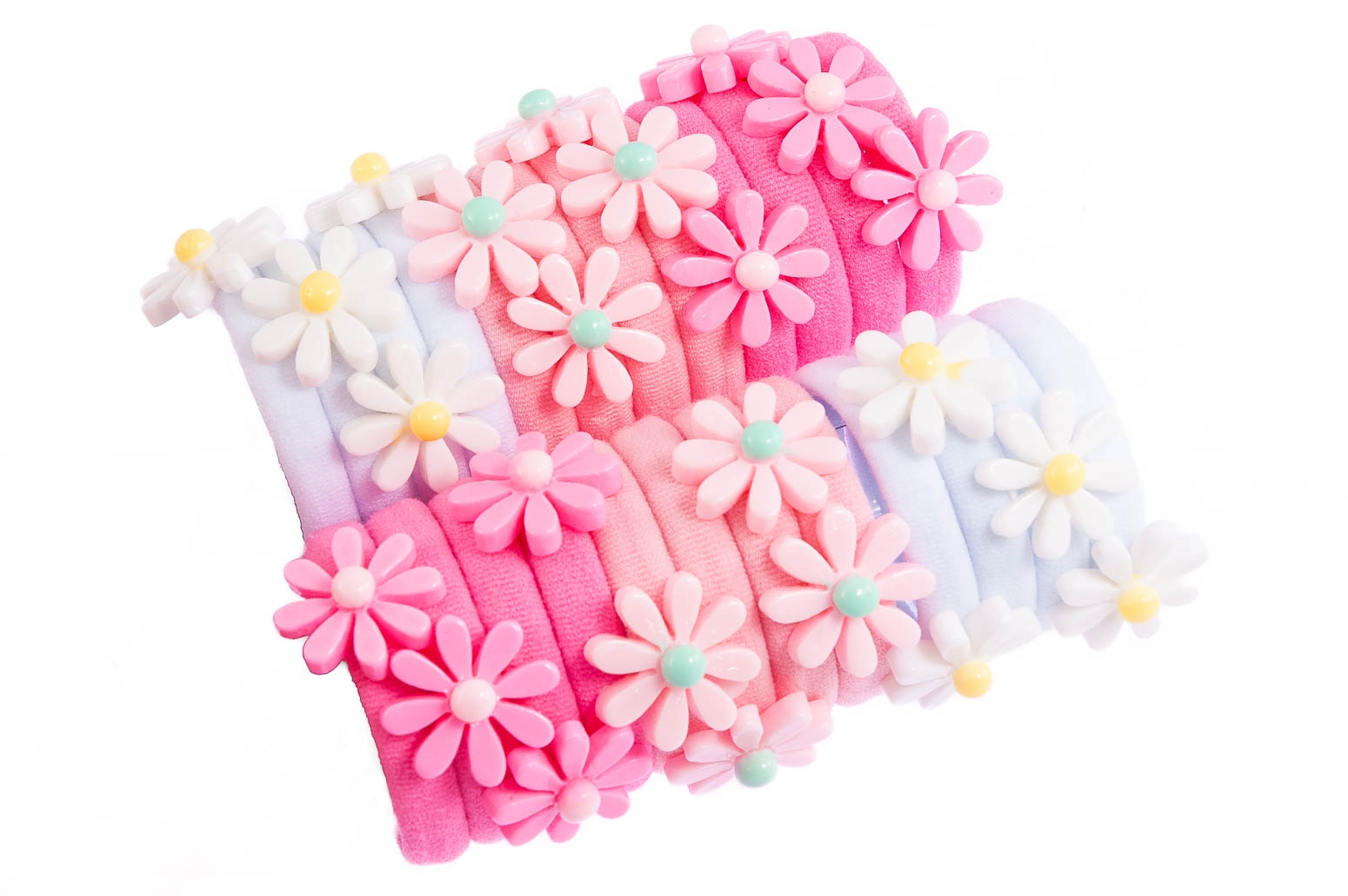 Klasyczne gumki do włosów z uroczą ozdobą w kształcie stokrotki.