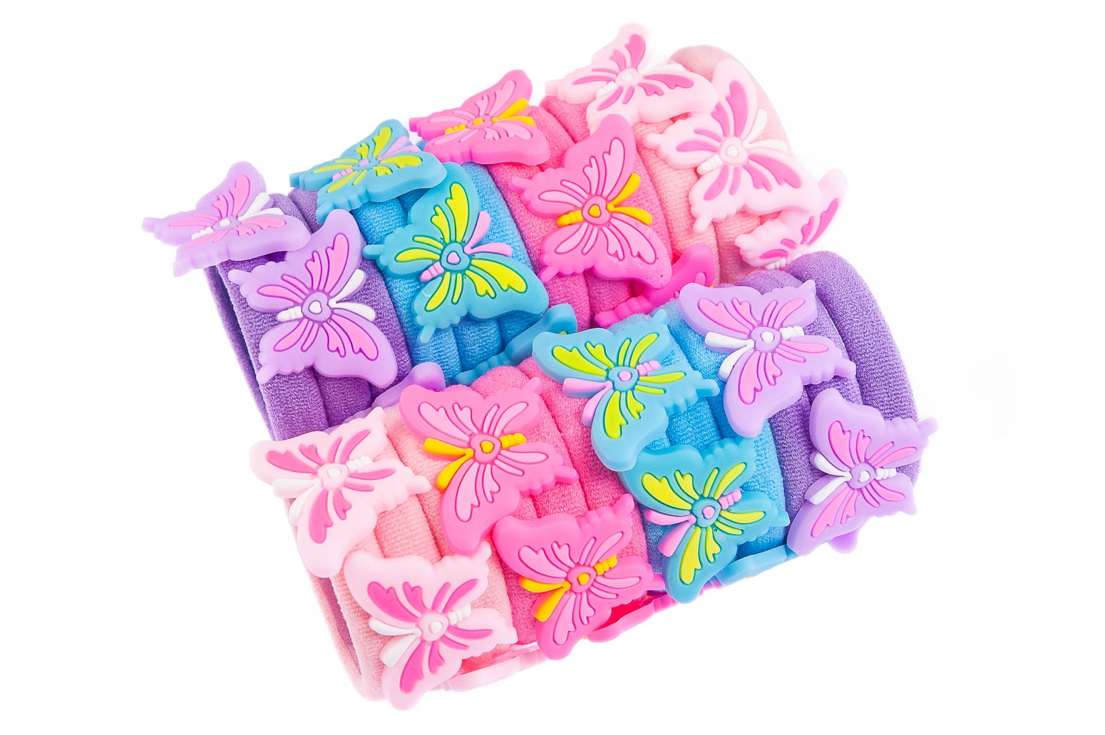 Klasyczne gumki do włosów z uroczą ozdobą w kształcie motylka.Zestaw składa się z czterech kolorów: niebieski, fioletowy, jasny i ciemny różowy.