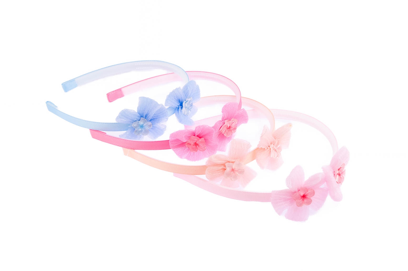 Opaska pokryta materiałem, ozdobiona materiałowymi kwiatuszkami.