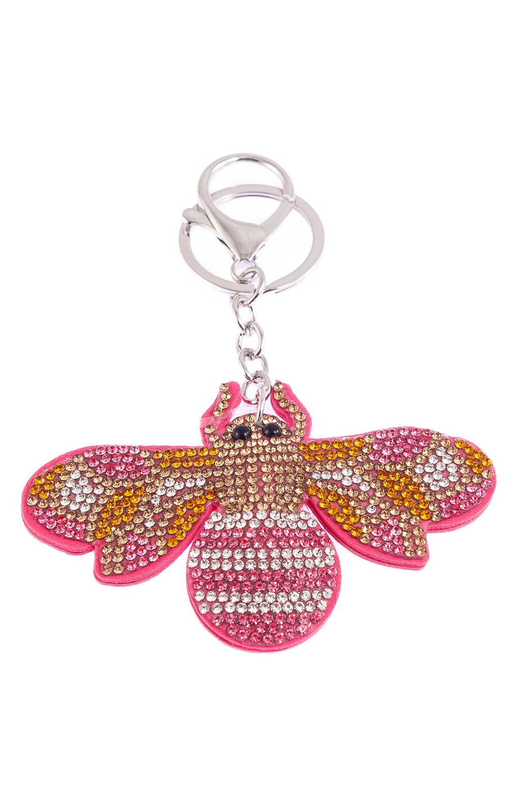 Elegancki brelok w kształcie osy, ozdobiony dżetami w kolorze żółtym, różowym i beżowym.Brelok idealnie nada się na prezent, który ucieszy każde dziecko.