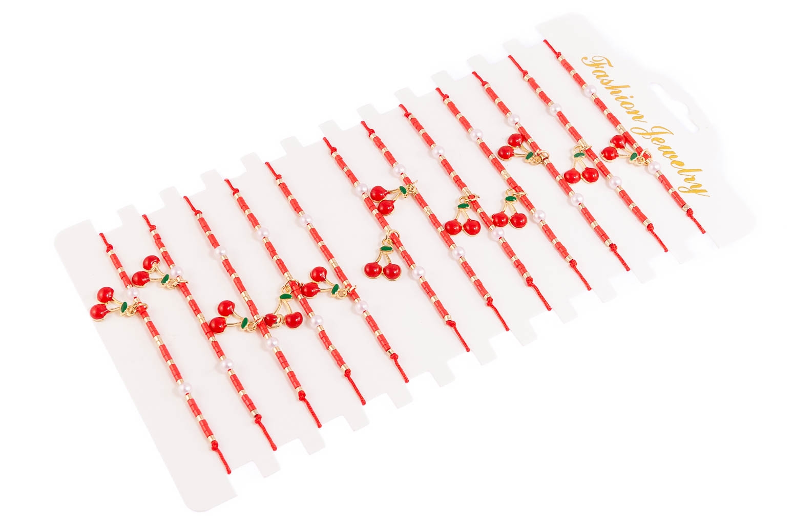 Elegancka bransoletka wykonana z koralików i przywieszki w kształcie wisienki.Zestaw składa się z bransoletek w czerwonym kolorze.