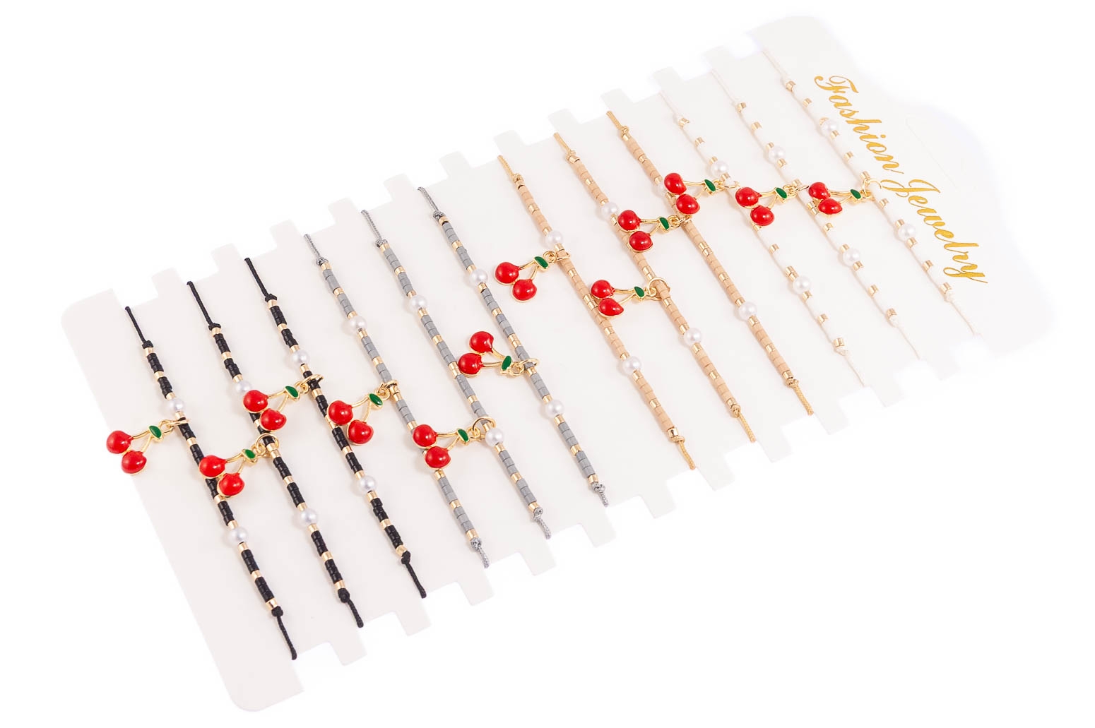 Elegancka bransoletka wykonana z koralików i przywieszki w kształcie wisienki.Zestaw składa się z czterech kolorów: biały, beżowy, szary i czarny.