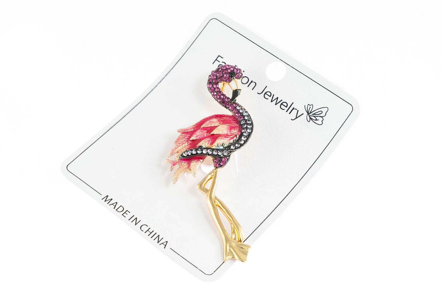 Elegancka broszka w kształcie flaminga. Przywieszka w kolorze złotym, ozdobiona szlifowanymi kamieniami i kolorową emalią.Ozdoba doda szyku każdej stylizacji.