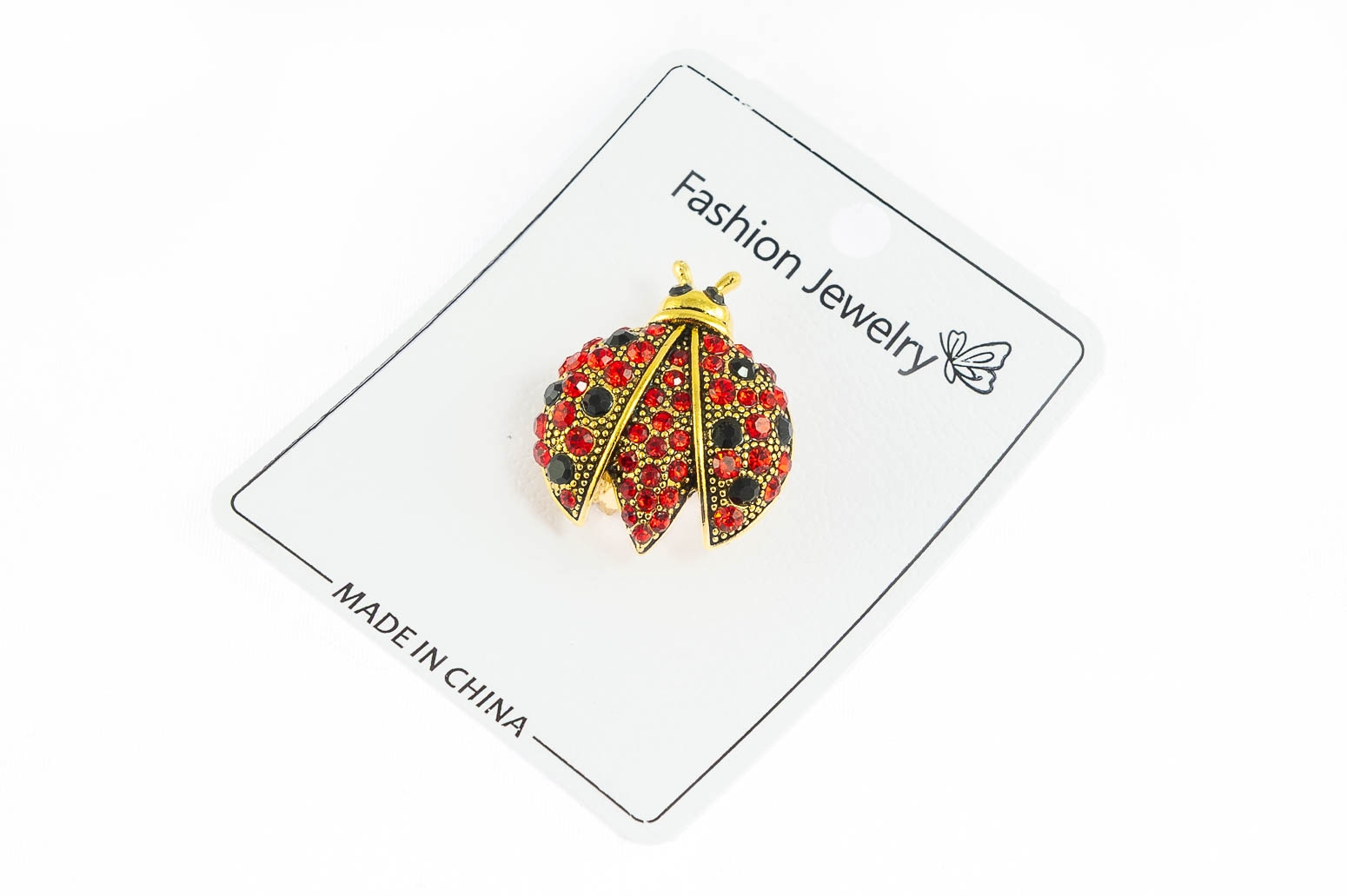 Elegancka broszka w kształcie biedronki. Przywieszka w kolorze srebrnym, ozdobiona szlifowanymi kamieniami w złotym i czarnym kolorze.Ozdoba doda szyku każdej stylizacji.