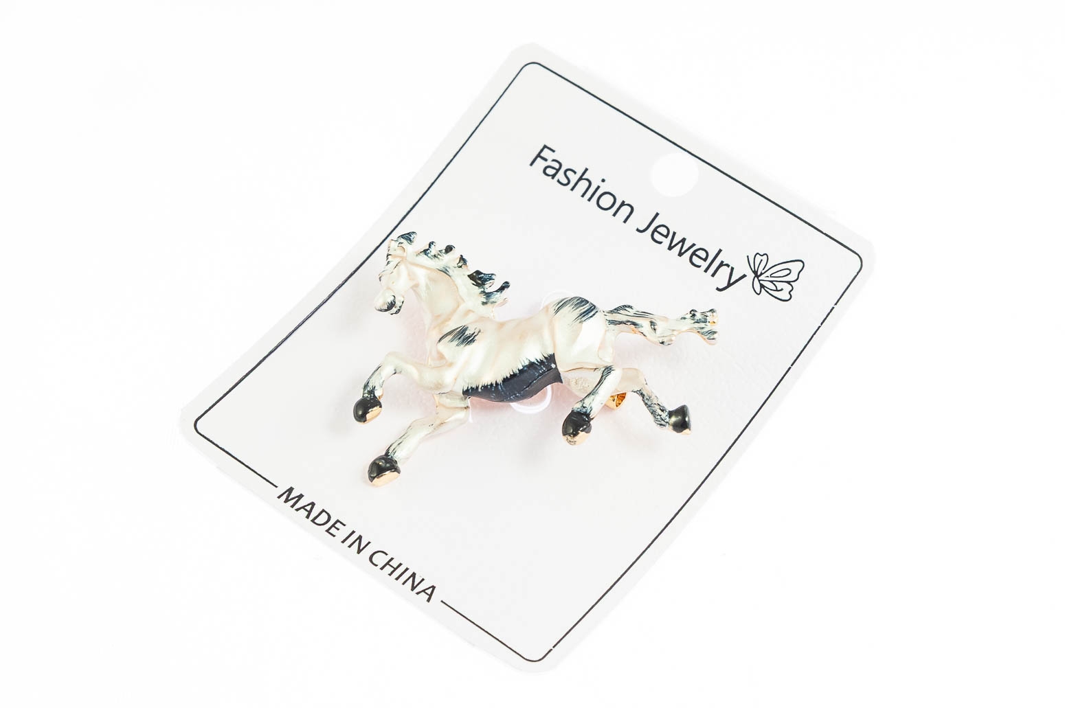 Elegancka broszka w kształcie konia. Przywieszka ozdobiona białą i czarną emalią.