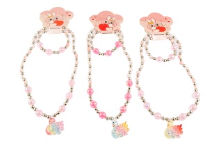 Komplet biżuterii dziecięcej, składający się z naszyjnika i bransoletki.