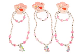 Komplet biżuterii dziecięcej, składający się z naszyjnika i bransoletki.Biżuteria wykonana z perełek i uroczej przywieszki w kształcie jednorożca.