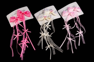 Klasyczne spinki z elegancką kokardą i szlifowanym serduszkie,. Zestaw składa się z trzech kolorów: beżowy, biały i brązowy. Wymiary: Długość: 9 cm Szerokość: 6cm