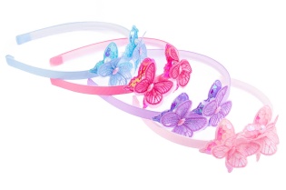 Opaska pokryta materiałem, ozdobiona materiałowymi kwiatuszkami.Zestaw skłąda się z czterech kolorów: błękitny, beżowy, jasny i ciemny różowy.