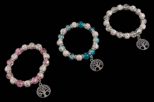 Elegancka bransoletka wykonana ze szlifowanych koralików i kwiatków.Zestaw składa się z trzech kolorów: różowy, niebieski i biały.