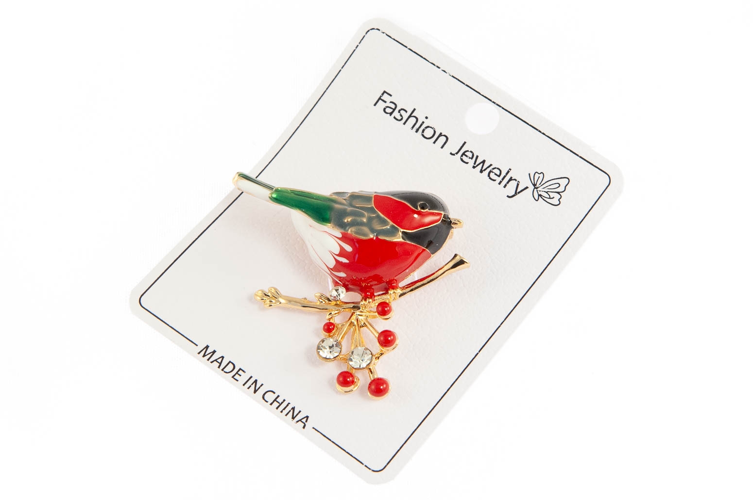 Elegancka broszka w kształcie ptaszka. Przywieszka w kolorze złotym, ozdobiona emalią i szlifowanymi kamieniami.