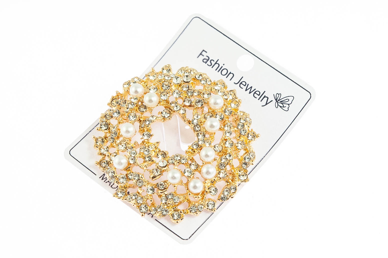 Elegancka broszka w kolorze złotym, ozdobiona szlifowanymi kamieniami i perłami.