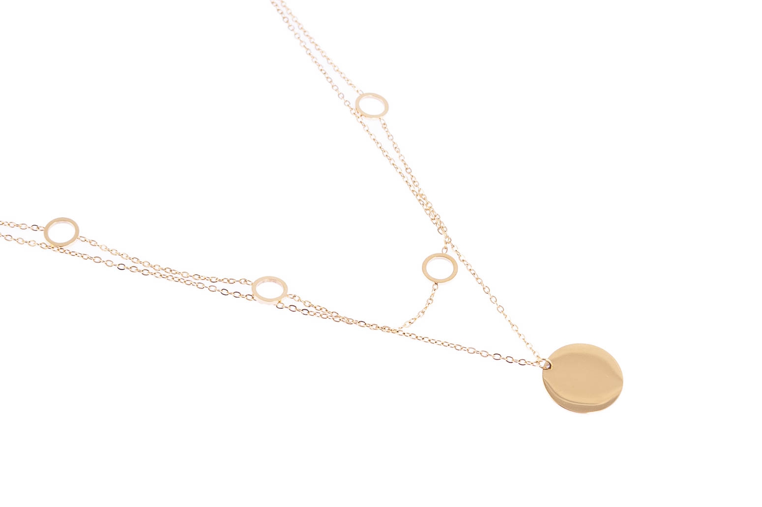 Elegancki łańcuszek z przywieszką. Naszyjnik jest w kolorze złotym.