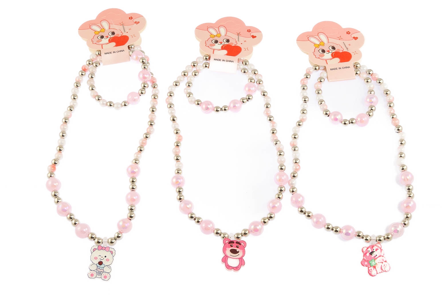Komplet biżuterii dziecięcej, składający się z naszyjnika i bransoletki.