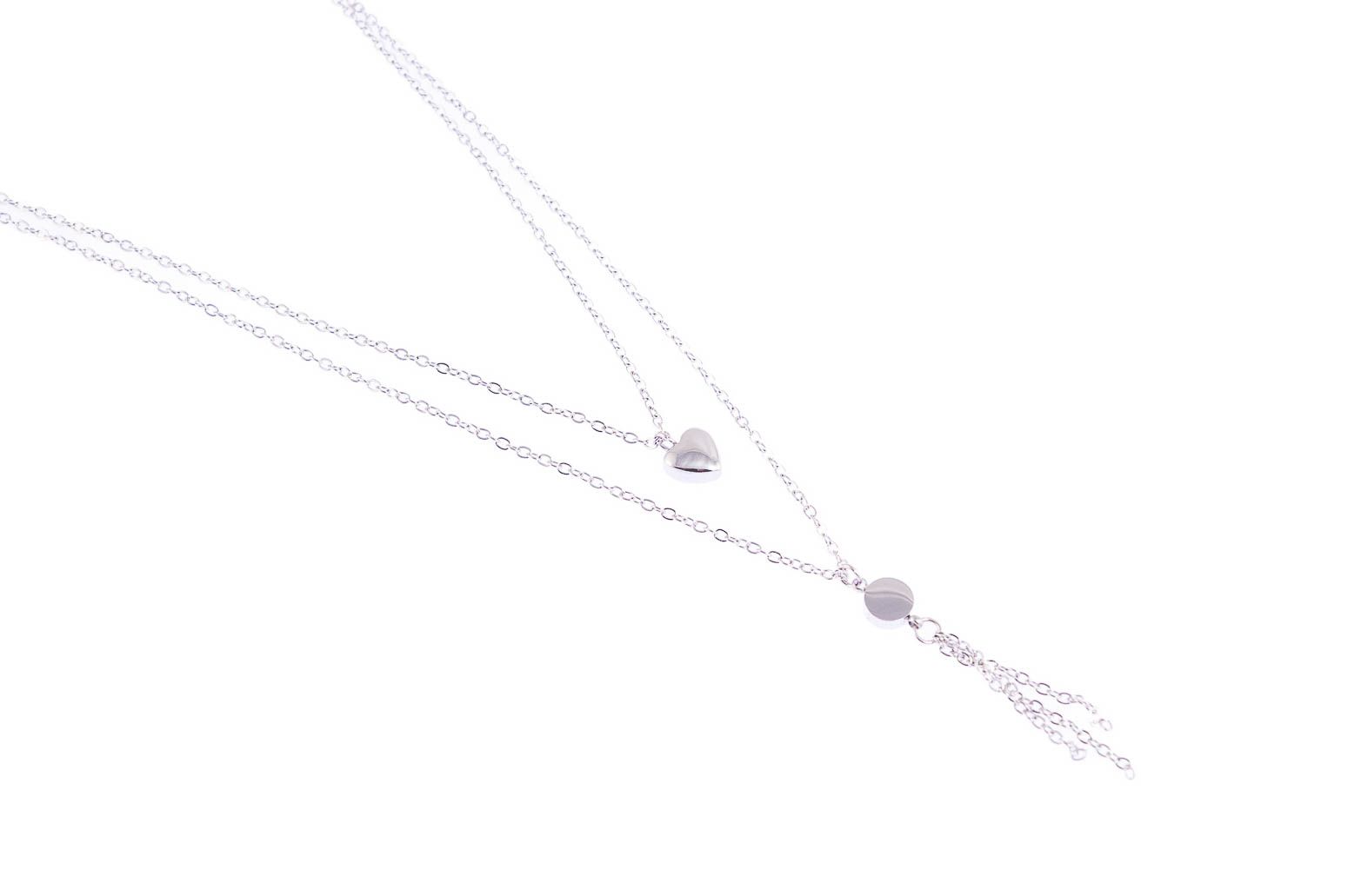 Elegancki łańcuszek z uroczą przywieszką w kształcie serduszka. Naszyjnik jest w kolorze srebrnym.