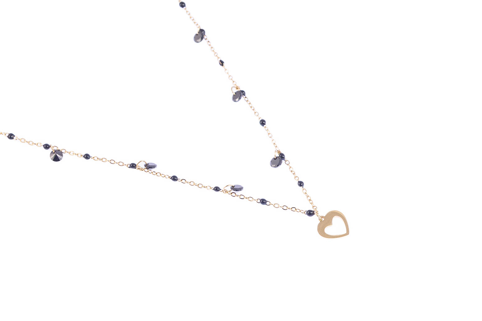 Elegancki łańcuszek z uroczą przywieszką w kształcie serca, ozdobiony szlifowanymi kamieniami. Naszyjnik jest w kolorze złotym.
